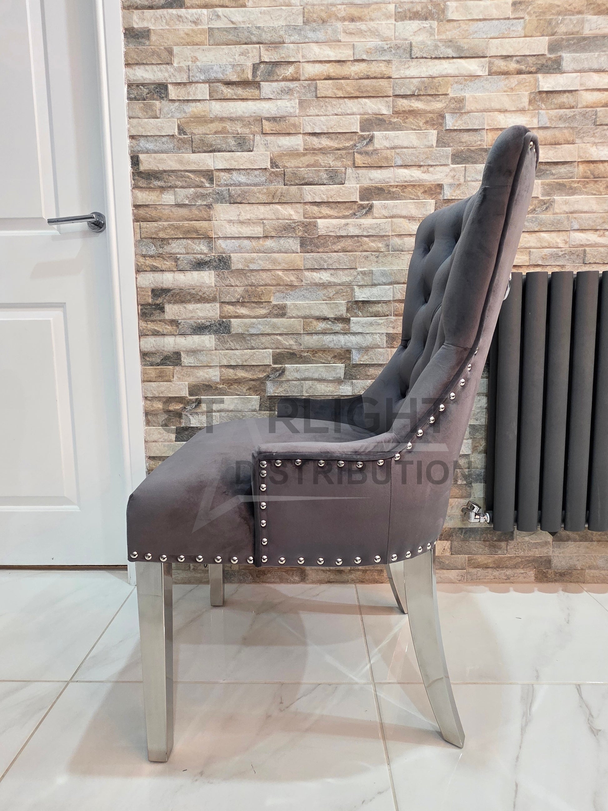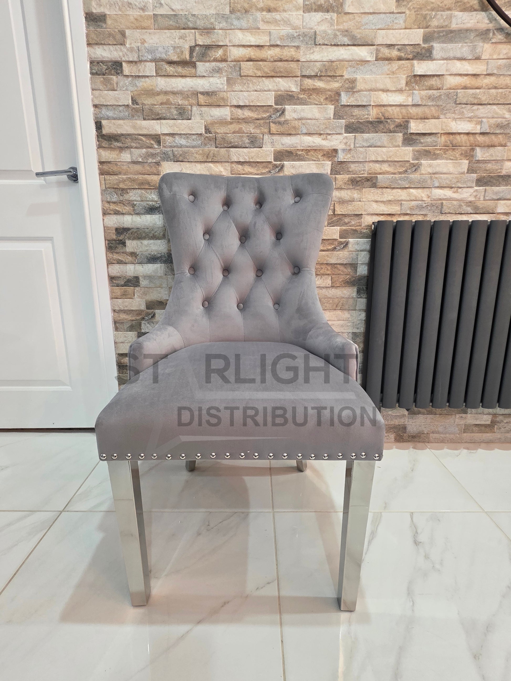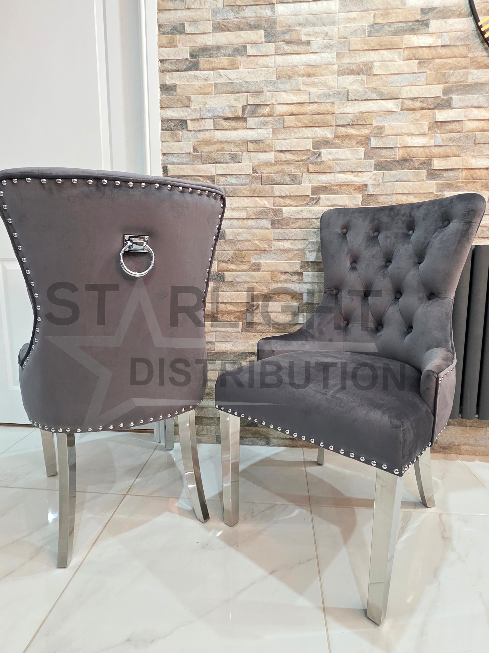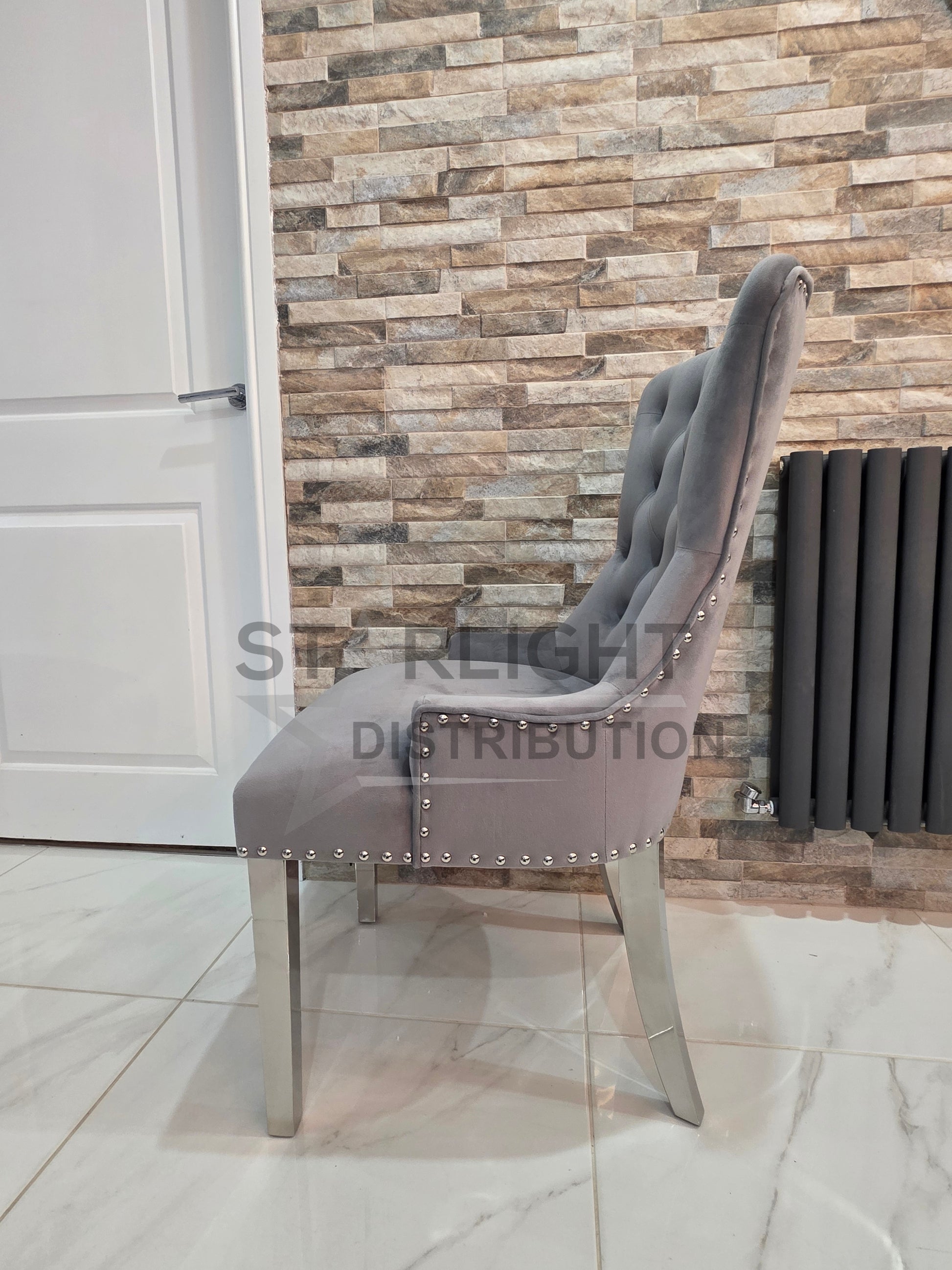 Set of 2 Luxury French Velvet Bull Ring KnockerBack Chairs with folded deep pocketed buttons, Create the WOW factor in your dining room. The luxurious french velvet has a soft brushed feel, the chair legs are solid Chrome creating that elegant look, very easy to clean with baby wipes. Available in Light grey or Dark grey